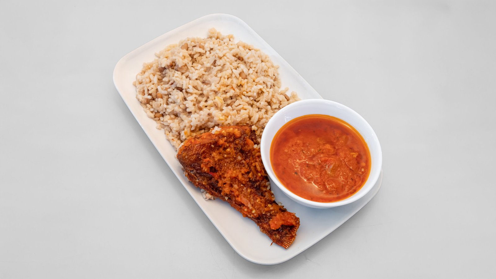 The perfect standard portion of rice and beans served alongside tilapia fish and plantain offers a delightful culinary experience.
